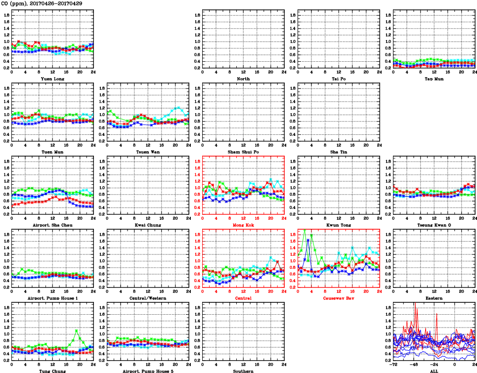 | Air Quality Data Time Series for CO (2017/04/29) | ( Line colors: Day -3 Day -2 Day -1 Current day ) | 2D Map Current AQHI |