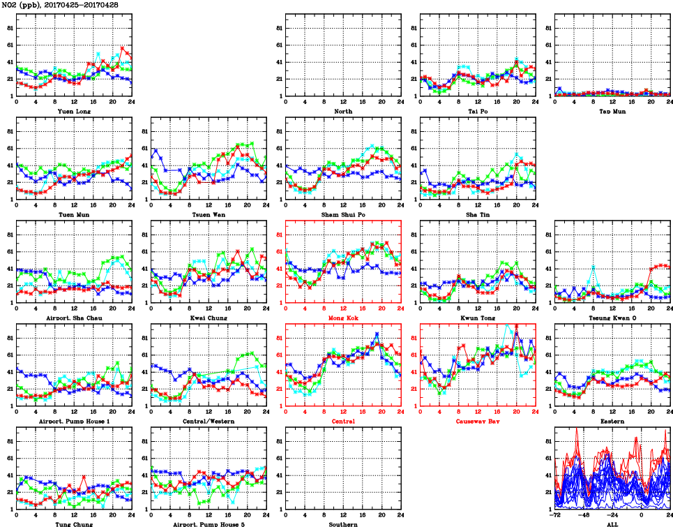 | Air Quality Data Time Series for NO2 (2017/04/28) | ( Line colors: Day -3 Day -2 Day -1 Current day ) | 2D Map Current AQHI |