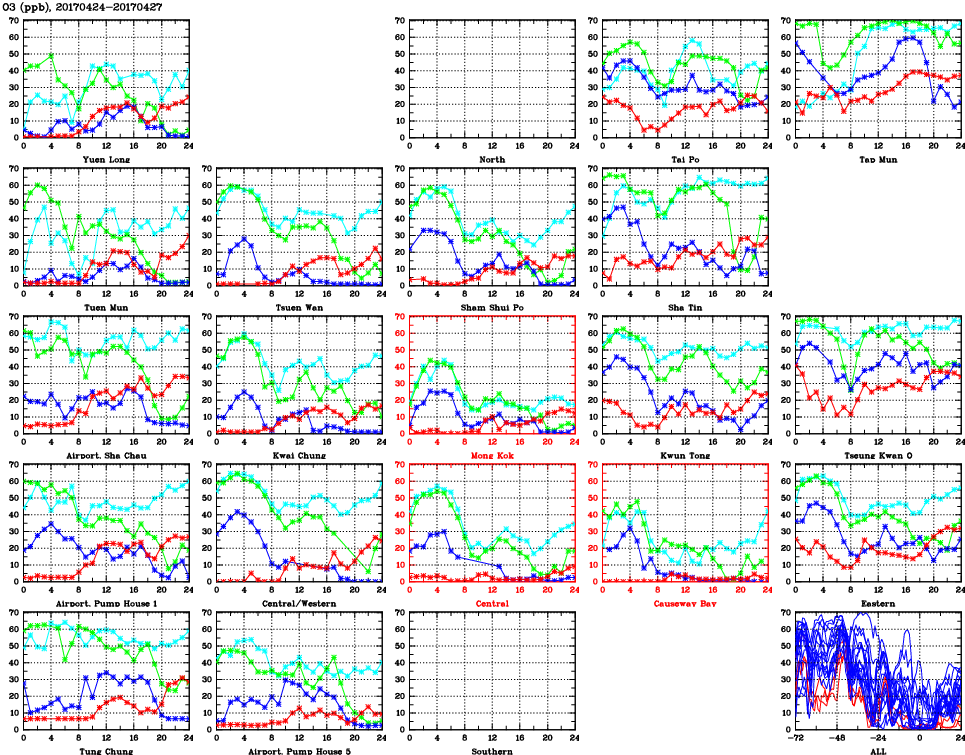 | Air Quality Data Time Series for O3 (2017/04/27) | ( Line colors: Day -3 Day -2 Day -1 Current day ) | 2D Map Current AQHI |