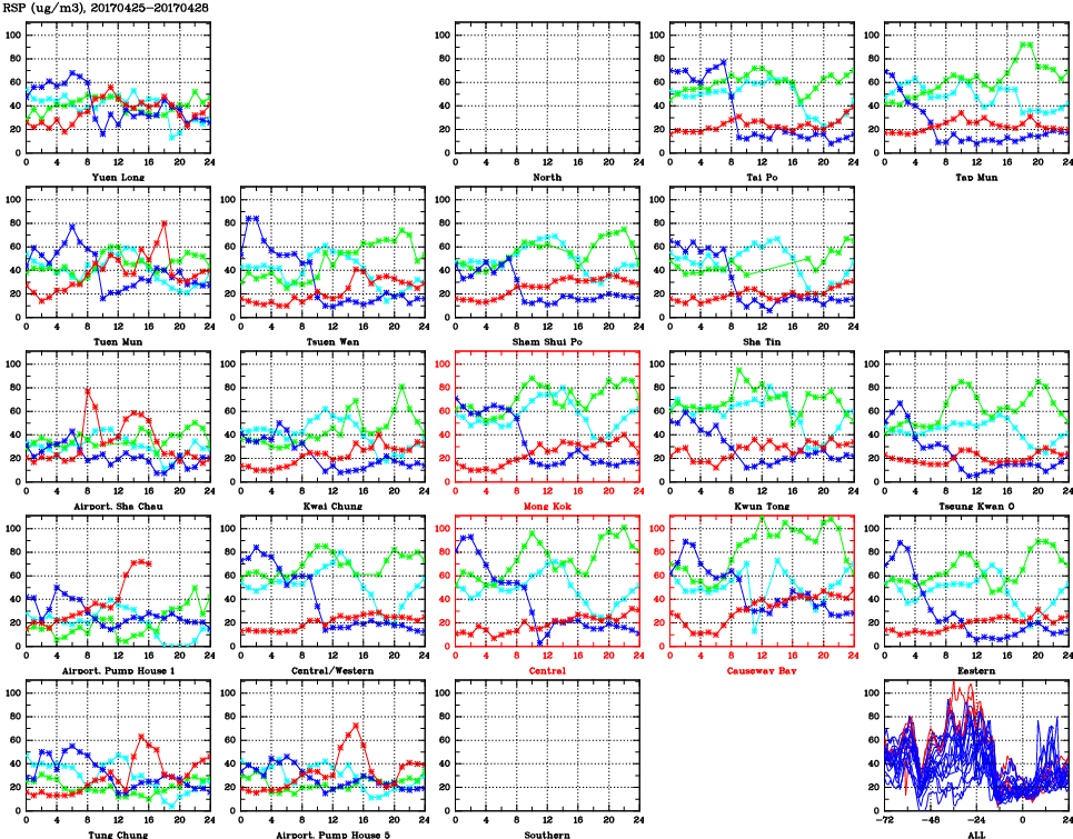 | Air Quality Data Time Series for RSP (2017/04/28) | ( Line colors: Day -3 Day -2 Day -1 Current day ) | 2D Map Current AQHI |