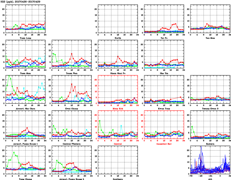 | Air Quality Data Time Series for SO2 (2017/04/29) | ( Line colors: Day -3 Day -2 Day -1 Current day ) | 2D Map Current AQHI |