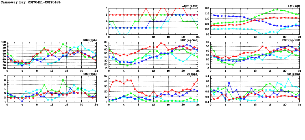| Air Quality Data Time Series in Causeway Bay (2017/04/24) | ( Line colors: Day -3 Day -2 Day -1 Current day ) | 2D Map Current AQHI |