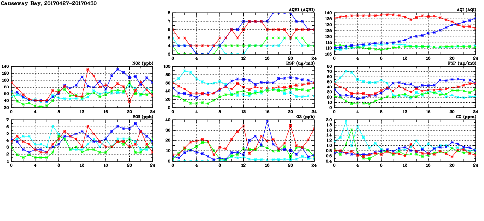 | Air Quality Data Time Series in Causeway Bay (2017/04/30) | ( Line colors: Day -3 Day -2 Day -1 Current day ) | 2D Map Current AQHI |