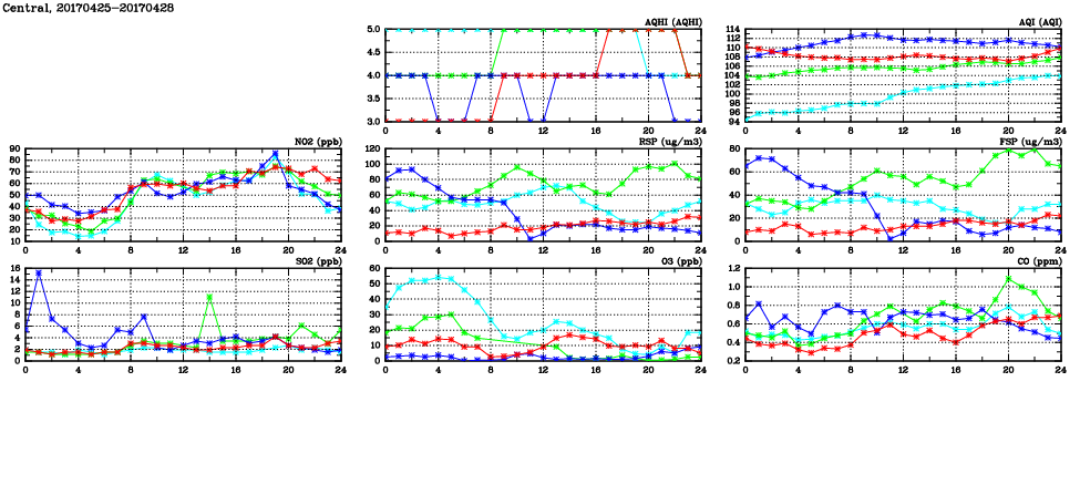 | Air Quality Data Time Series in Central (2017/04/28) | ( Line colors: Day -3 Day -2 Day -1 Current day ) | 2D Map Current AQHI |