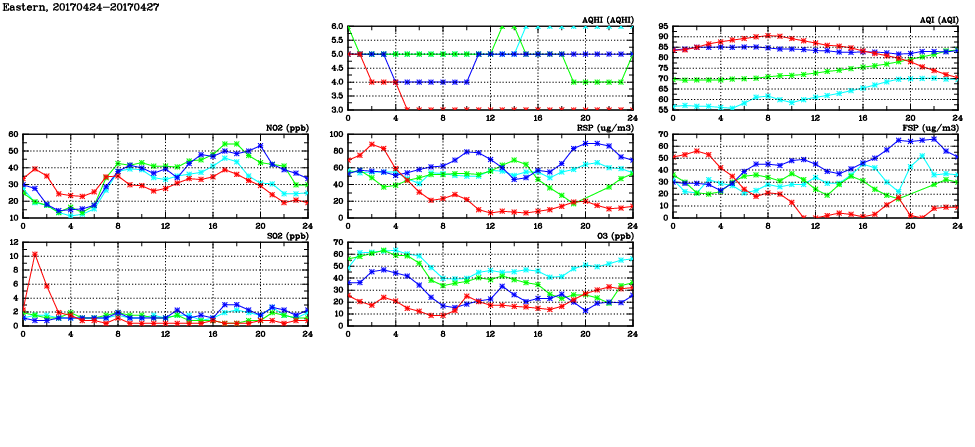 | Air Quality Data Time Series in Eastern (2017/04/27) | ( Line colors: Day -3 Day -2 Day -1 Current day ) | 2D Map Current AQHI |