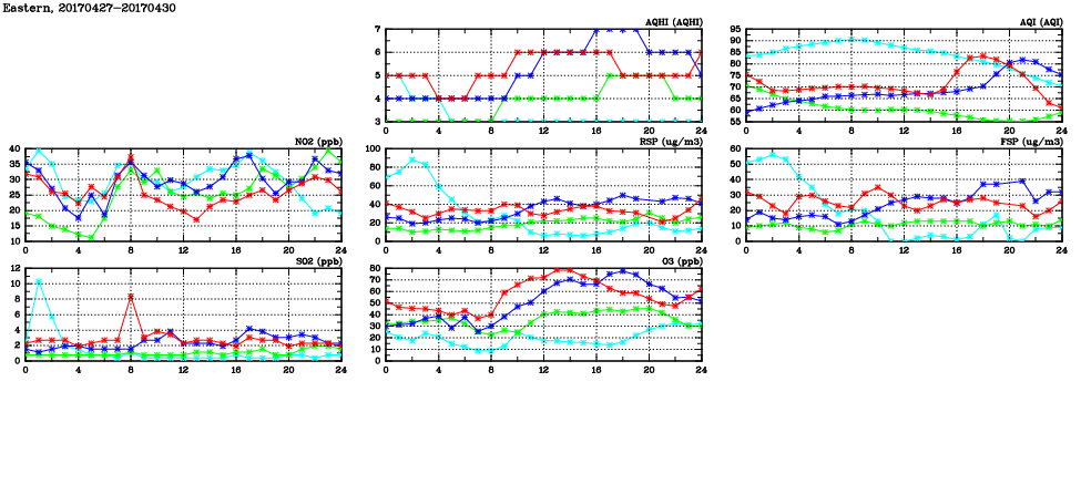 | Air Quality Data Time Series in Eastern (2017/04/30) | ( Line colors: Day -3 Day -2 Day -1 Current day ) | 2D Map Current AQHI |