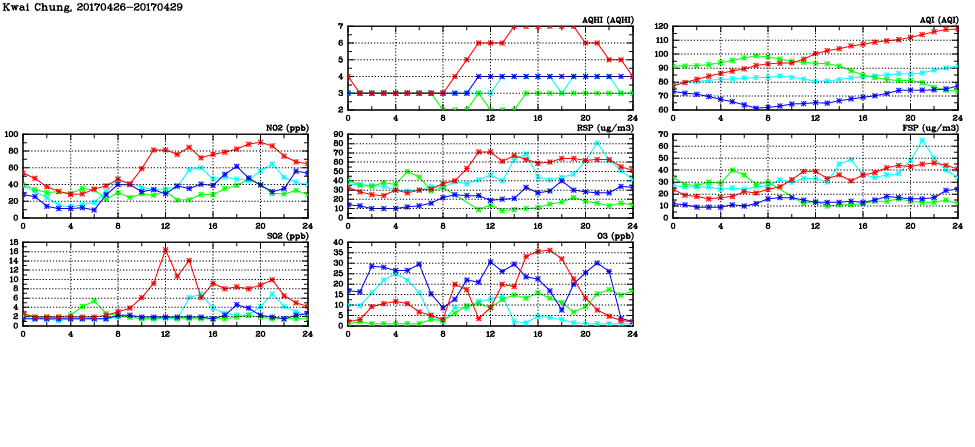 | Air Quality Data Time Series in Kwai Chung (2017/04/29) | ( Line colors: Day -3 Day -2 Day -1 Current day ) | 2D Map Current AQHI |