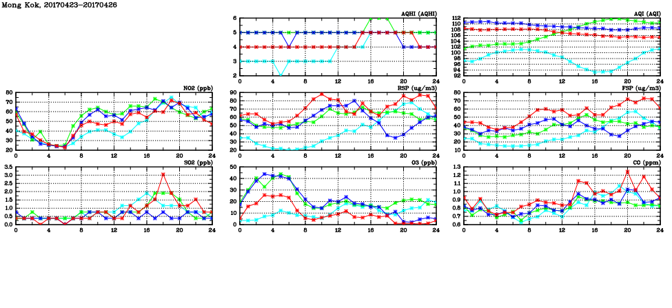 | Air Quality Data Time Series in Mong Kok (2017/04/26) | ( Line colors: Day -3 Day -2 Day -1 Current day ) | 2D Map Current AQHI |