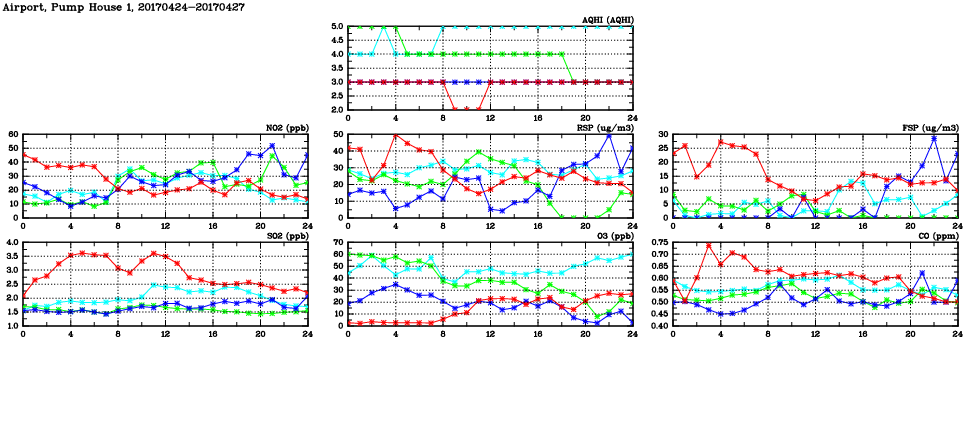 | Air Quality Data Time Series in Airport, Pump House 1 (2017/04/27) | ( Line colors: Day -3 Day -2 Day -1 Current day ) | 2D Map Current AQHI |
