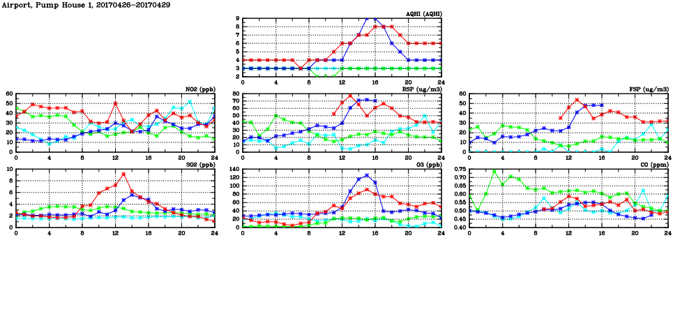 | Air Quality Data Time Series in Airport, Pump House 1 (2017/04/29) | ( Line colors: Day -3 Day -2 Day -1 Current day ) | 2D Map Current AQHI |