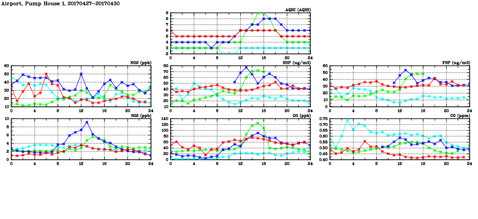| Air Quality Data Time Series in Airport, Pump House 1 (2017/04/30) | ( Line colors: Day -3 Day -2 Day -1 Current day ) | 2D Map Current AQHI |