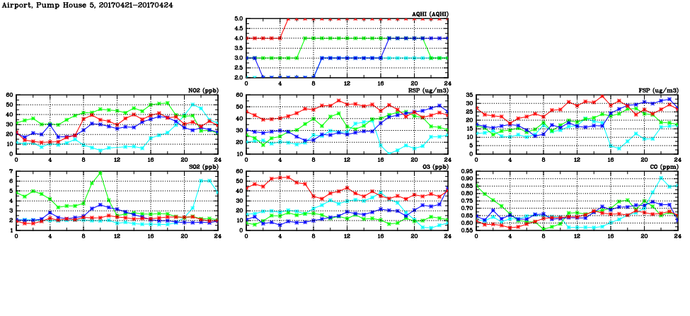 | Air Quality Data Time Series in Airport, Pump House 5 (2017/04/24) | ( Line colors: Day -3 Day -2 Day -1 Current day ) | 2D Map Current AQHI |