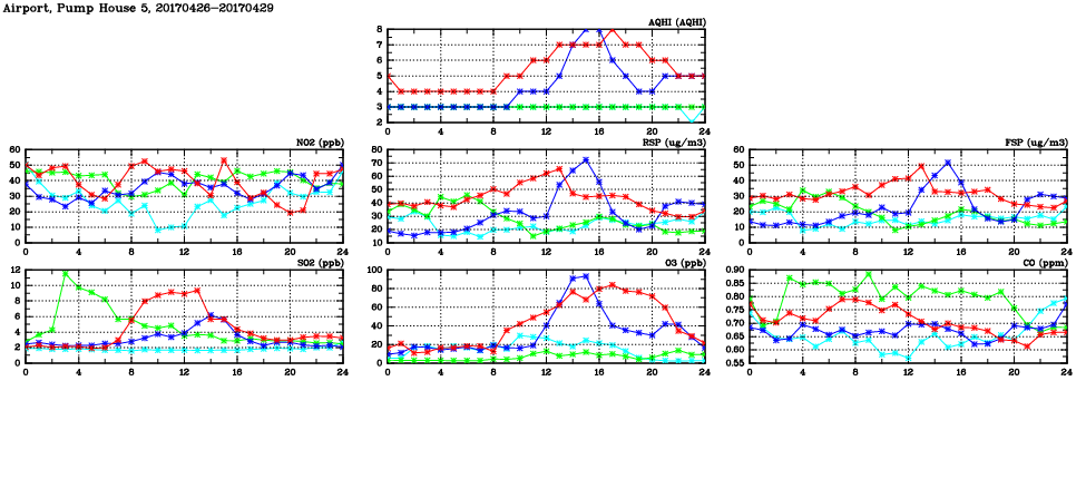 | Air Quality Data Time Series in Airport, Pump House 5 (2017/04/29) | ( Line colors: Day -3 Day -2 Day -1 Current day ) | 2D Map Current AQHI |