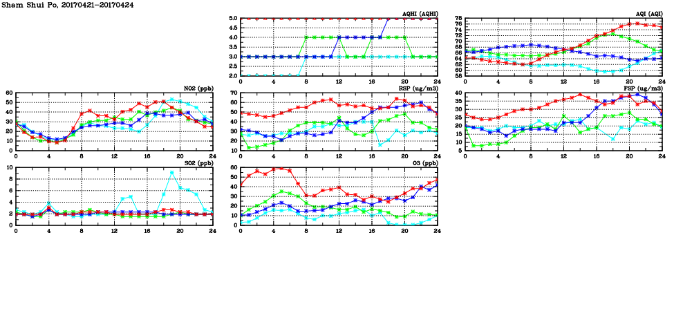 | Air Quality Data Time Series in Sham Shui Po (2017/04/24) | ( Line colors: Day -3 Day -2 Day -1 Current day ) | 2D Map Current AQHI |