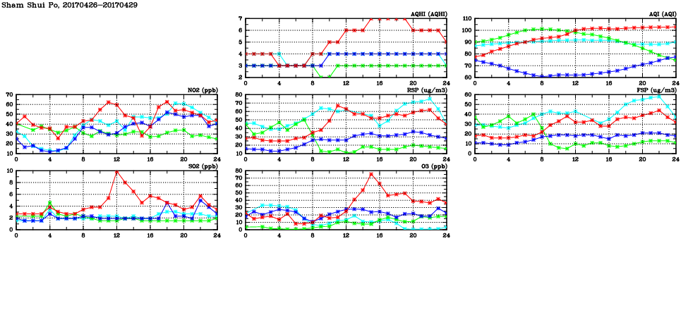 | Air Quality Data Time Series in Sham Shui Po (2017/04/29) | ( Line colors: Day -3 Day -2 Day -1 Current day ) | 2D Map Current AQHI |