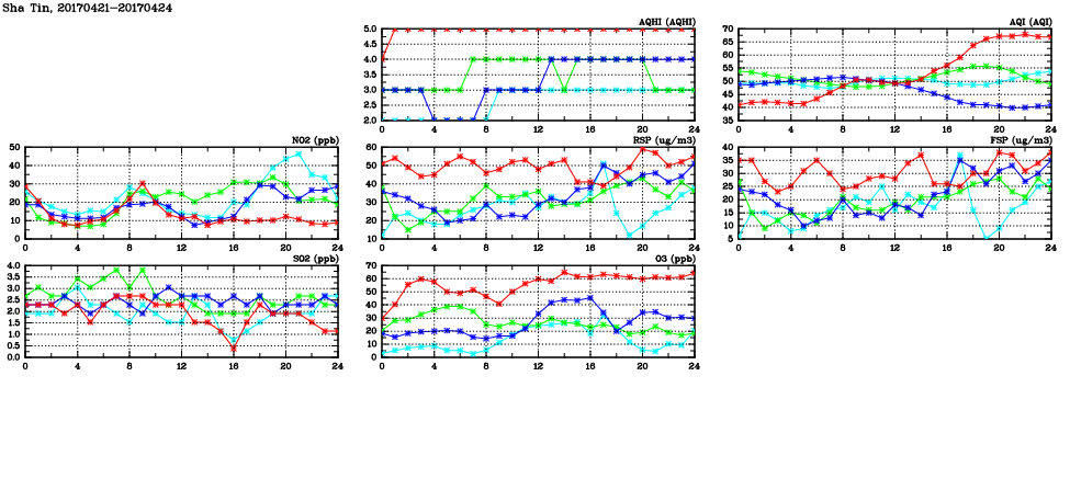 | Air Quality Data Time Series in Sha Tin (2017/04/24) | ( Line colors: Day -3 Day -2 Day -1 Current day ) | 2D Map Current AQHI |