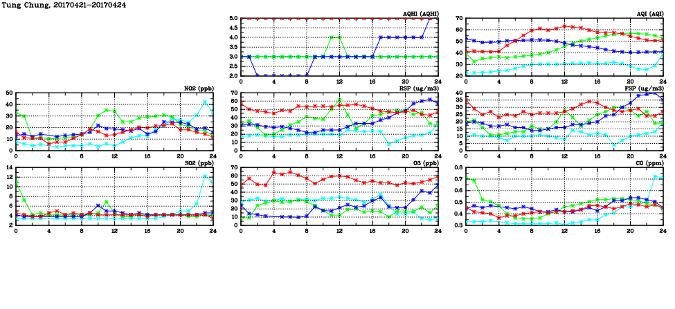 | Air Quality Data Time Series in Tung Chung (2017/04/24) | ( Line colors: Day -3 Day -2 Day -1 Current day ) | 2D Map Current AQHI |
