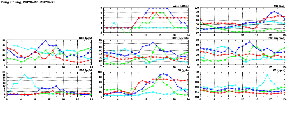 | Air Quality Data Time Series in Tung Chung (2017/04/30) | ( Line colors: Day -3 Day -2 Day -1 Current day ) | 2D Map Current AQHI |