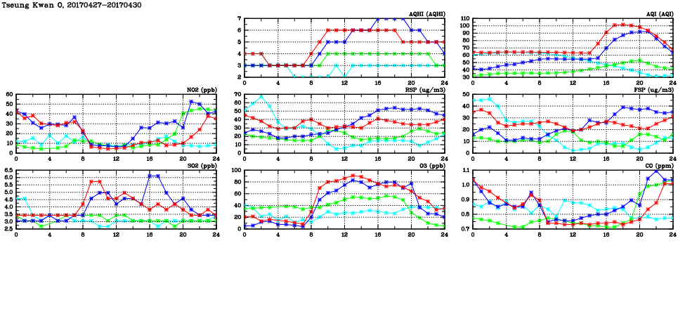 | Air Quality Data Time Series in Tseung Kwan O (2017/04/30) | ( Line colors: Day -3 Day -2 Day -1 Current day ) | 2D Map Current AQHI |