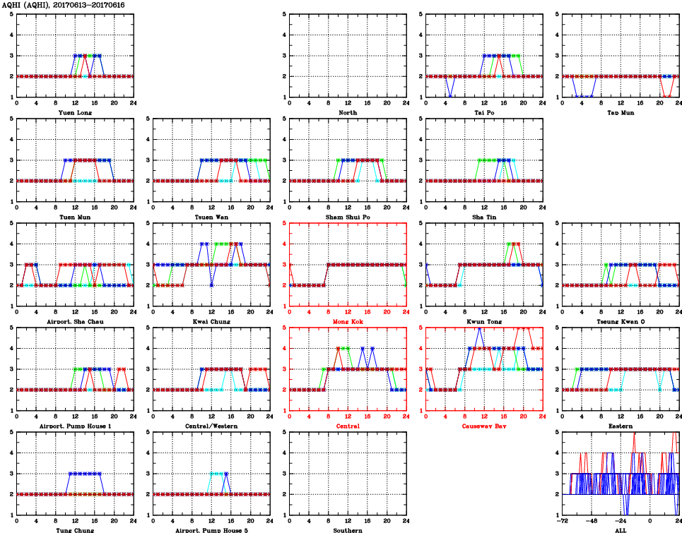 | Air Quality Data Time Series for AQHI (2017/06/16) | ( Line colors: Day -3 Day -2 Day -1 Current day ) | 2D Map Current AQHI |