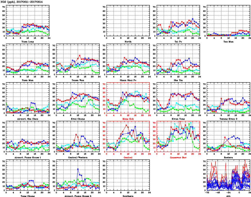 Air Quality Data Time Series for NO2 (2017/06/14) | ( Line colors: Day -3 Day -2 Day -1 Current day ) | 2D Map Current AQHI |