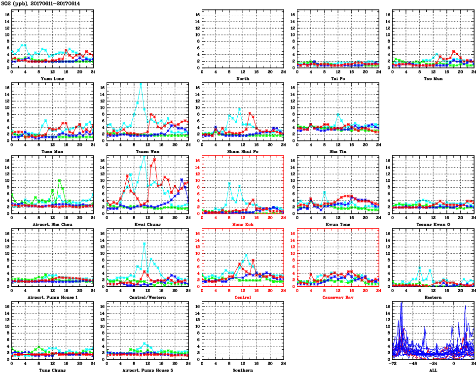 | Air Quality Data Time Series for SO2 (2017/06/14) | ( Line colors: Day -3 Day -2 Day -1 Current day ) | 2D Map Current AQHI |