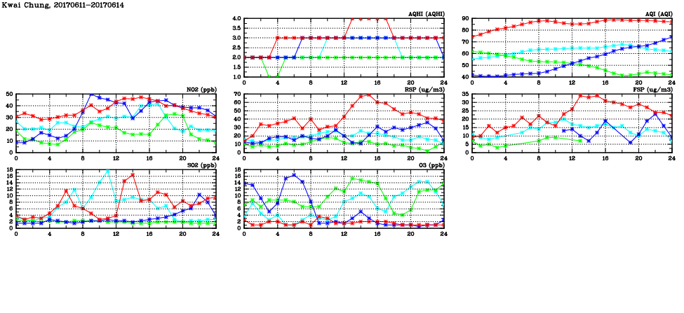 | Air Quality Data Time Series in Kwai Chung (2017/06/14) | ( Line colors: Day -3 Day -2 Day -1 Current day ) | 2D Map Current AQHI |