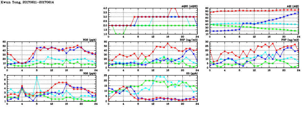 | Air Quality Data Time Series in Kwun Tong (2017/06/14) | ( Line colors: Day -3 Day -2 Day -1 Current day ) | 2D Map Current AQHI |