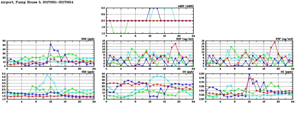 | Air Quality Data Time Series in Airport, Pump House 5 (2017/06/14) | ( Line colors: Day -3 Day -2 Day -1 Current day ) | 2D Map Current AQHI |