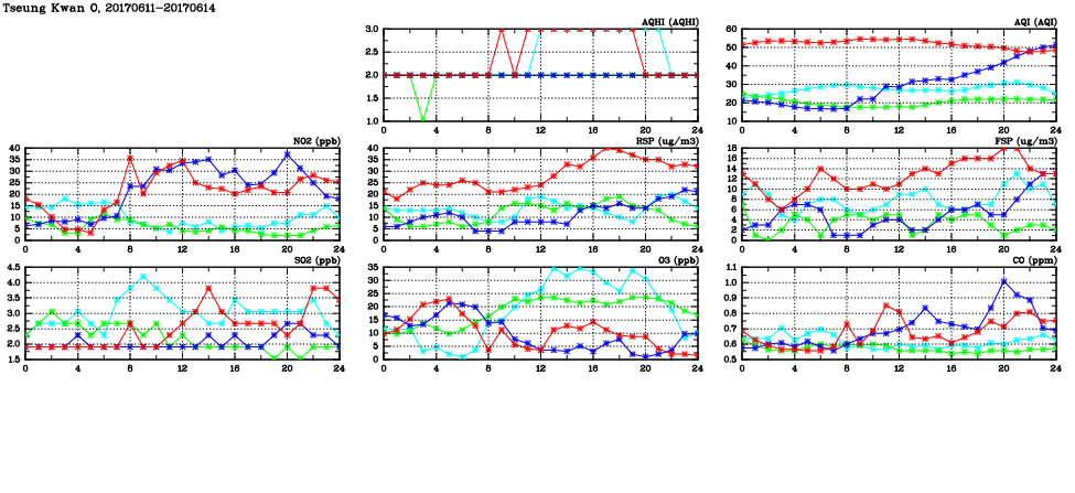 | Air Quality Data Time Series in Tseung Kwan O (2017/06/14) | ( Line colors: Day -3 Day -2 Day -1 Current day ) | 2D Map Current AQHI |