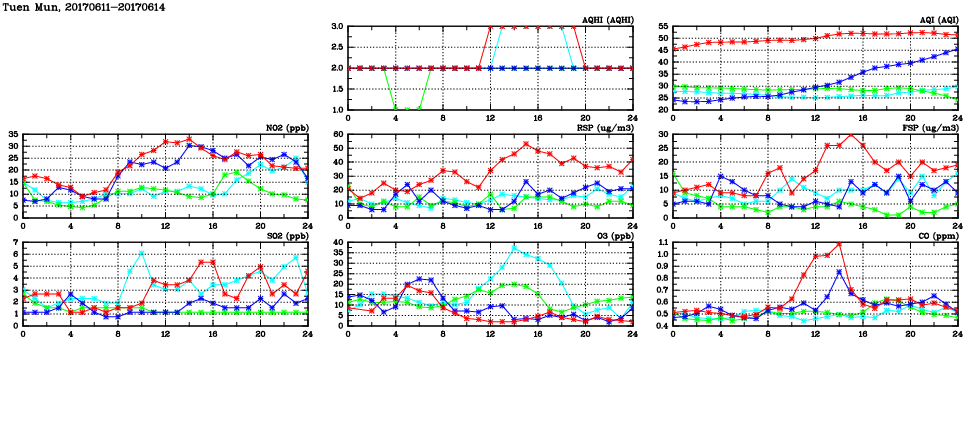 | Air Quality Data Time Series in Tuen Mun (2017/06/14) | ( Line colors: Day -3 Day -2 Day -1 Current day ) | 2D Map Current AQHI |