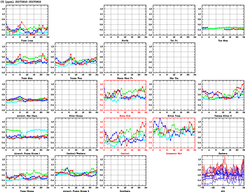 | Air Quality Data Time Series for CO (2017/06/19) | ( Line colors: Day -3 Day -2 Day -1 Current day ) | 2D Map Current AQHI |