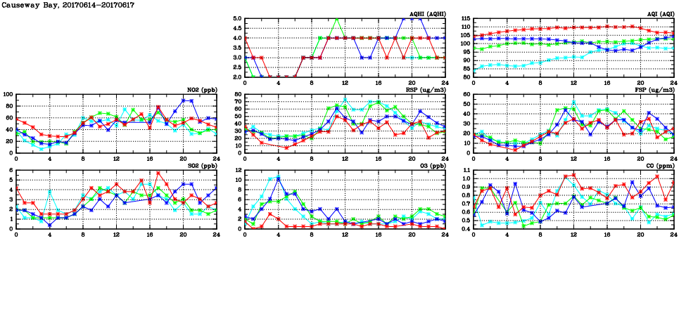 | Air Quality Data Time Series in Causeway Bay (2017/06/17) | ( Line colors: Day -3 Day -2 Day -1 Current day ) | 2D Map Current AQHI |