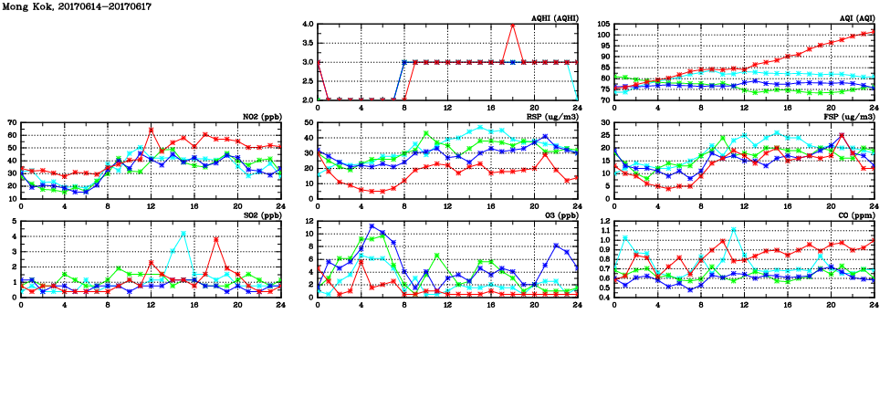 | Air Quality Data Time Series in Mong Kok (2017/06/17) | ( Line colors: Day -3 Day -2 Day -1 Current day ) | 2D Map Current AQHI |