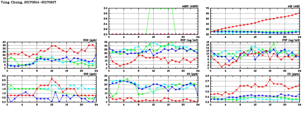 | Air Quality Data Time Series in Tung Chung (2017/06/17) | ( Line colors: Day -3 Day -2 Day -1 Current day ) | 2D Map Current AQHI |