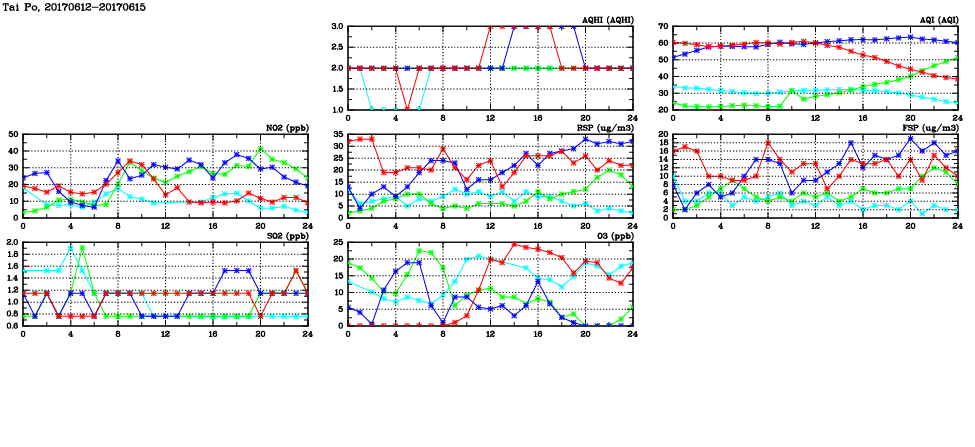 | Air Quality Data Time Series in Tai Po (2017/06/15) | ( Line colors: Day -3 Day -2 Day -1 Current day ) | 2D Map Current AQHI |