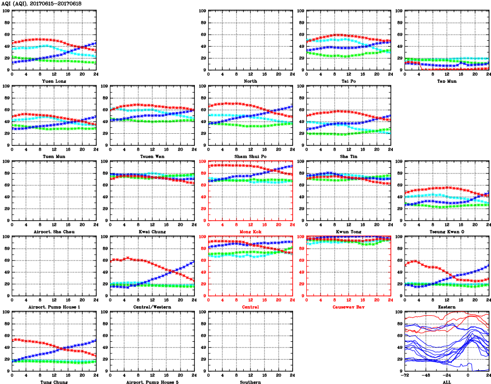 | Air Quality Data Time Series for AQI (2017/06/18) | ( Line colors: Day -3 Day -2 Day -1 Current day ) | 2D Map Current AQHI |