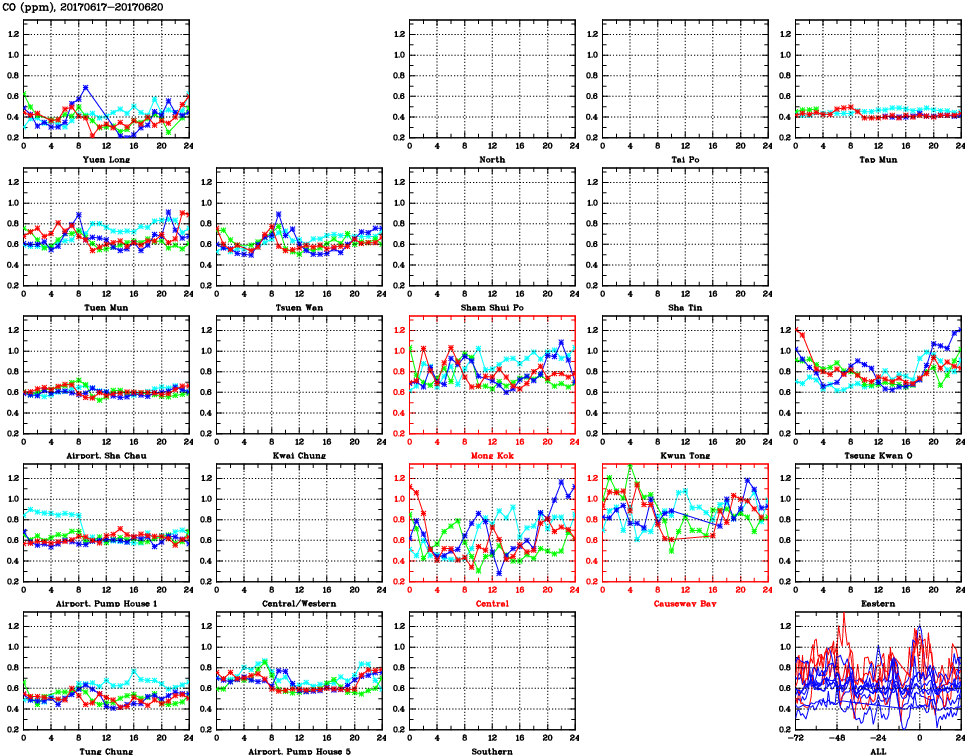 | Air Quality Data Time Series for CO (2017/06/20) | ( Line colors: Day -3 Day -2 Day -1 Current day ) | 2D Map Current AQHI |