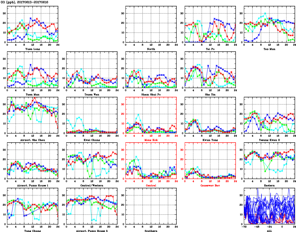 | Air Quality Data Time Series for O3 (2017/06/16) | ( Line colors: Day -3 Day -2 Day -1 Current day ) | 2D Map Current AQHI |