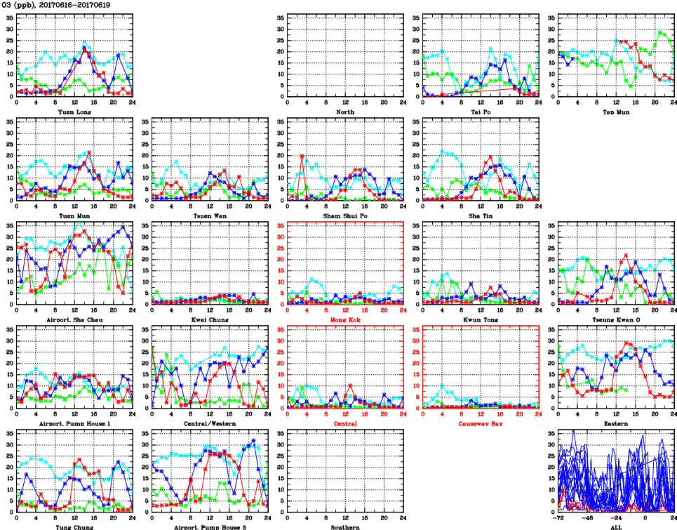 | Air Quality Data Time Series for O3 (2017/06/19) | ( Line colors: Day -3 Day -2 Day -1 Current day ) | 2D Map Current AQHI |