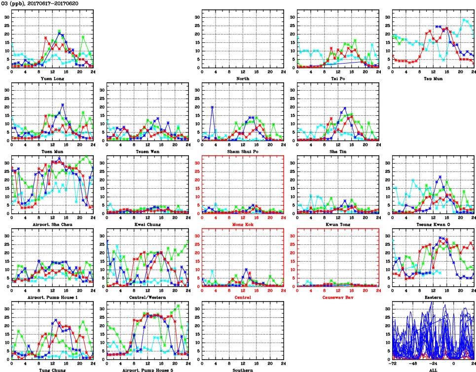 | Air Quality Data Time Series for O3 (2017/06/20) | ( Line colors: Day -3 Day -2 Day -1 Current day ) | 2D Map Current AQHI |