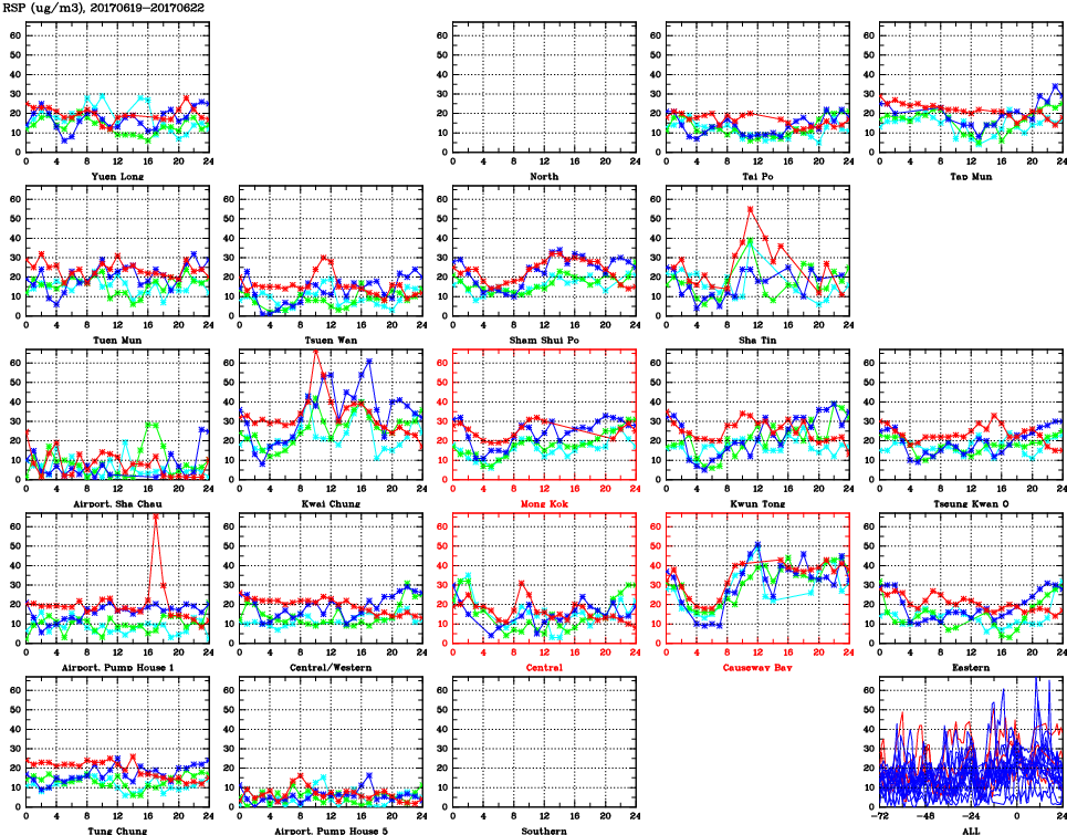 | Air Quality Data Time Series for RSP (2017/06/22) | ( Line colors: Day -3 Day -2 Day -1 Current day ) | 2D Map Current AQHI |