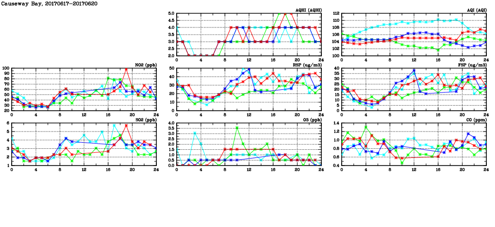 | Air Quality Data Time Series in Causeway Bay (2017/06/20) | ( Line colors: Day -3 Day -2 Day -1 Current day ) | 2D Map Current AQHI |