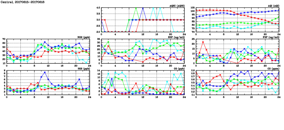 | Air Quality Data Time Series in Central (2017/06/18) | ( Line colors: Day -3 Day -2 Day -1 Current day ) | 2D Map Current AQHI |
