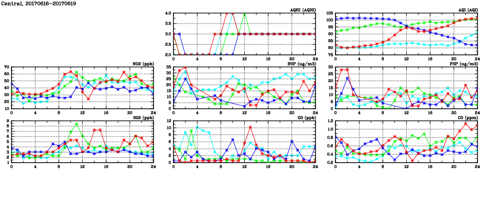 | Air Quality Data Time Series in Central (2017/06/19) | ( Line colors: Day -3 Day -2 Day -1 Current day ) | 2D Map Current AQHI |