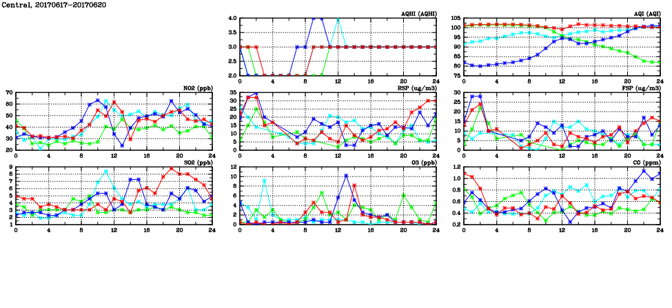 | Air Quality Data Time Series in Central (2017/06/20) | ( Line colors: Day -3 Day -2 Day -1 Current day ) | 2D Map Current AQHI |