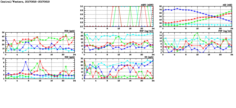 | Air Quality Data Time Series in Central/Western (2017/06/19) | ( Line colors: Day -3 Day -2 Day -1 Current day ) | 2D Map Current AQHI |