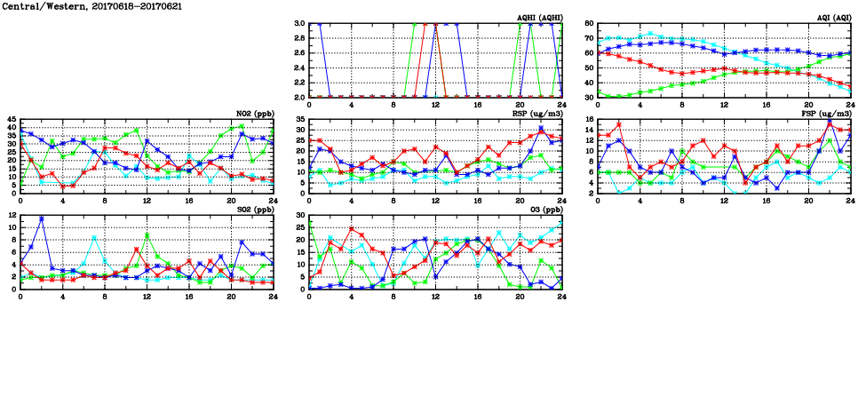 | Air Quality Data Time Series in Central/Western (2017/06/21) | ( Line colors: Day -3 Day -2 Day -1 Current day ) | 2D Map Current AQHI |