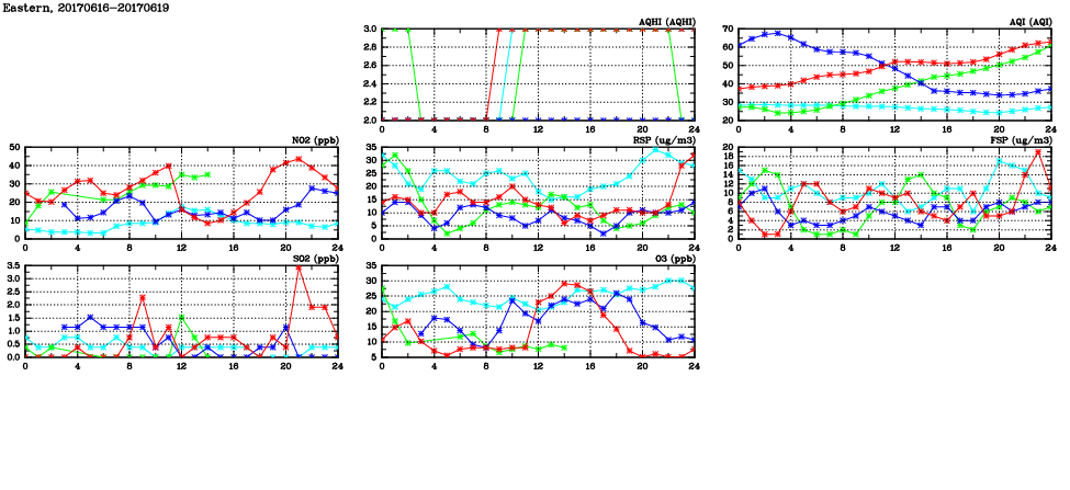 | Air Quality Data Time Series in Eastern (2017/06/19) | ( Line colors: Day -3 Day -2 Day -1 Current day ) | 2D Map Current AQHI |