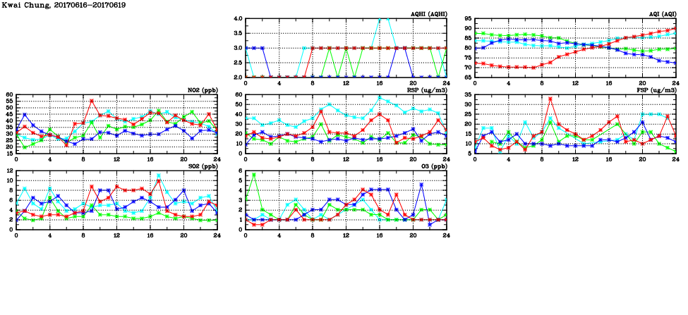 | Air Quality Data Time Series in Kwai Chung (2017/06/19) | ( Line colors: Day -3 Day -2 Day -1 Current day ) | 2D Map Current AQHI |
